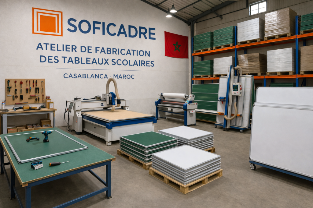 Soficadre est une entreprise située à Casablanca, spécialisée dans la fabrication et la vente de tableau scolaire pour les écoles, les centres de formation et les établissements d’enseignement au Maroc. L’entreprise propose plusieurs modèles comme le tableau blanc magnétique, le tableau craie, le tableau pivotant, le tableau mobile et le tableau en liège. Chaque tableau scolaire est fabriqué avec des matériaux solides pour une utilisation durable en salle de classe. Sodicadre propose aussi la fabrication sur mesure pour répondre aux besoins de chaque établissement.